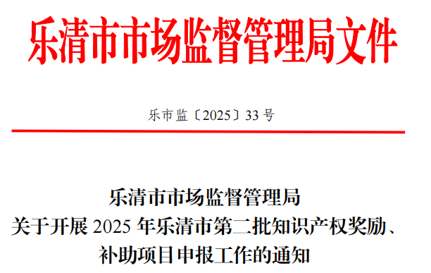 乐清市市场监督管理局关于开展2025年乐清市第二批知识产权奖励、补助项目申报工作的通知